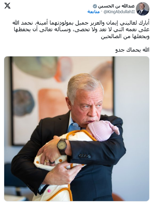 وبهذه المناسبة، نشر جلالة الملك عبدالله الثاني على حسابه في "إكس - تويتر" صورة له وهو يحمل حفيدته، مرفقا إياها بتهنئة مؤثرة: