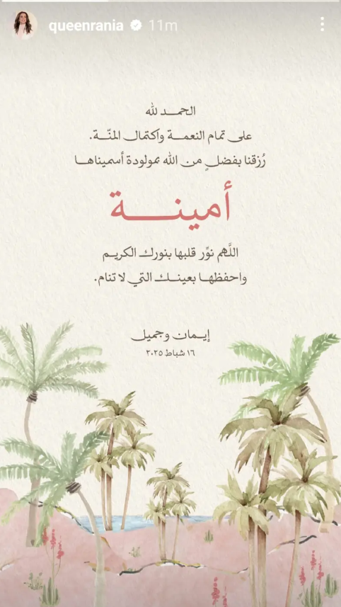 - الملكة رانيا تهنئ الأميرة إيمان بقدوم حفيدتها الأولى "أمينة"
