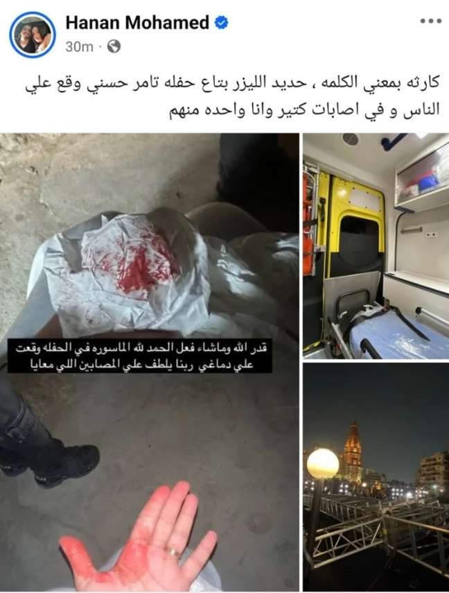 - انهيار حاجز إنارة خلال حفل تامر حسني في مصر يسفر عن إصابة العشرات